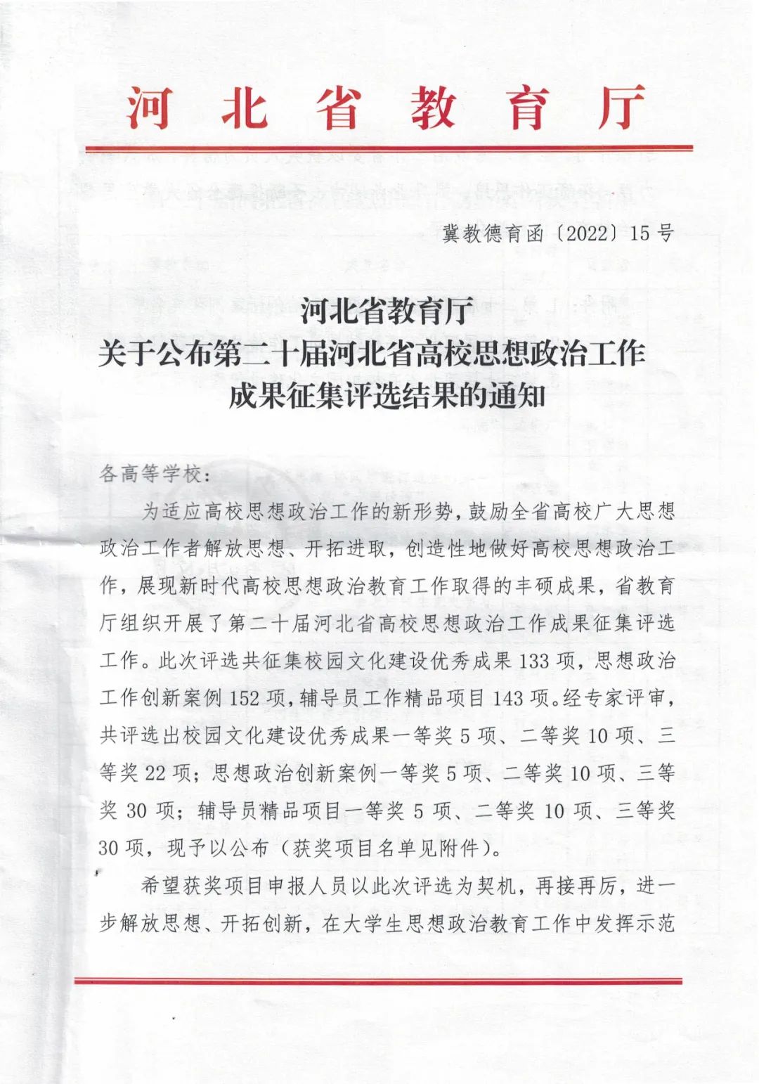 近日,河北省教育厅下发《关于公布第二十届河北省高校思想政治工作成果征集评选结果的通知》(冀教德育函【2022】15号),由学校党委副书记、校长郑书深主持,党委委员、副校长林雪霞、公共教学部主任孙孟军、教务处副处长陈亚参与的《扬中医传统文化,育优秀医学人才——邢台医学高等专科学校“扁鹊文化”树人工程》项目荣获河北省高校校园文化建设优秀成果一等奖。