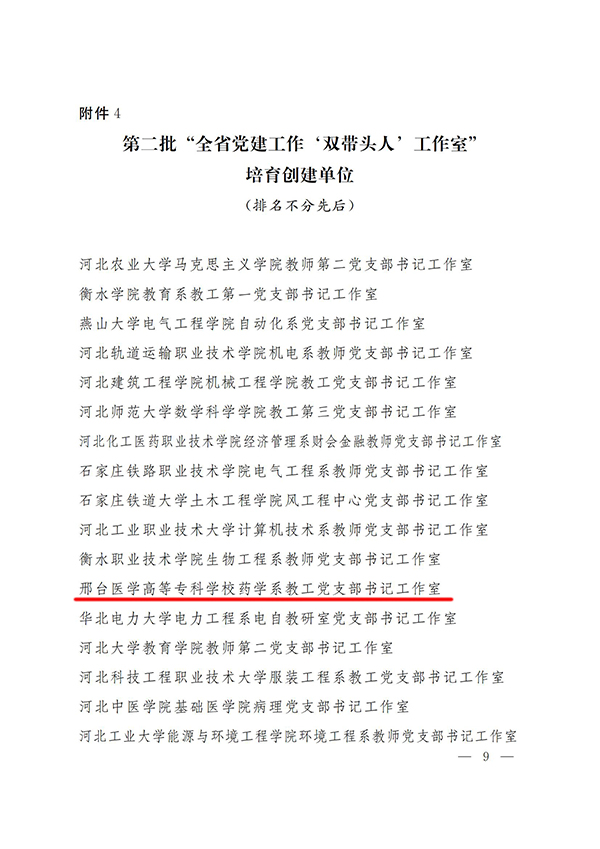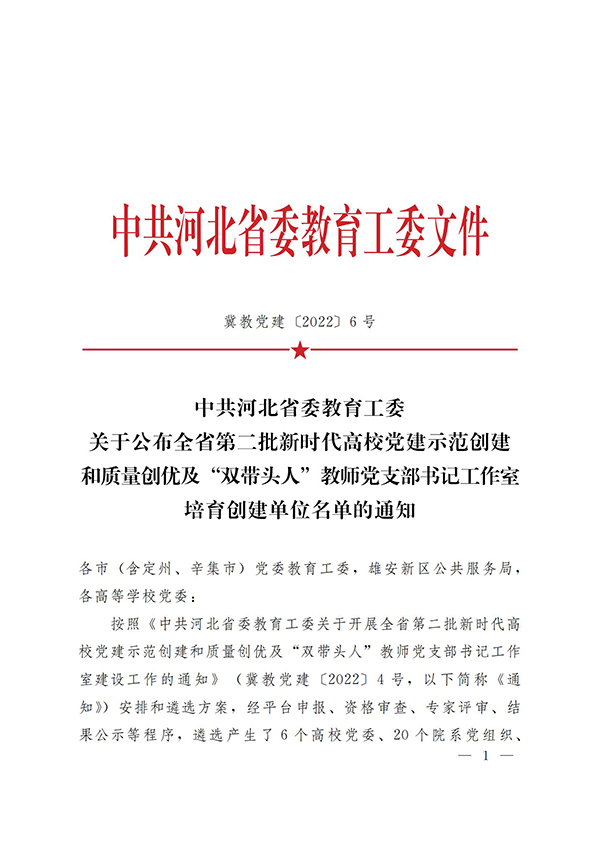 近日,中共河北省委教育工委印发《关于公布全省第二批新时代高校党建示范创建和质量创优及“双带头人”教师党支部书记工作室培育创建单位名单的通知》(冀教党建〔2022〕6号),对遴选产生的6个高校党委、20个院系党组织、30个党支部和30个“双带头人”教师党支部作为全省第二批党建工作示范高校、标杆院系、样板支部和“双带头人”教师党支部书记工作室培育创建单位予以公布,开元药学系教工党支部书记工作室入选第二批全省高校 “双带头人”教师党支部书记工作室培育创建单位名单。
