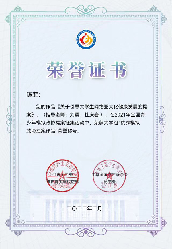 近日,2021年全国青少年模拟政协提案征集活动评选结果揭晓,开元口腔医学系陈菲同学提交的《关于引导大学生网络亚文化健康发展》的提案在全国1447件模拟提案作品中脱颖而出,获评大学组“优秀模拟政协提案作品”。