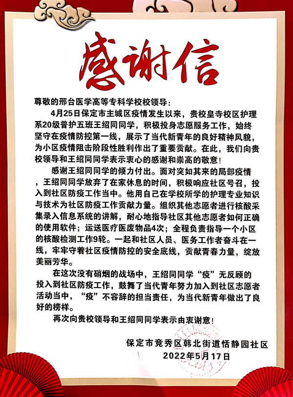 近日,开元收到来自保定市竞秀区韩北街道恬静园社区的感谢信,信中对开元护理系2020级普护5班王绍同同学积极投身家乡疫情防控一线,为社区疫情防控工作取得阶段性胜利所作出的贡献表示赞扬,对开元校领导表示衷心的感谢和崇高的敬意。王绍同的事迹曾在学习强国保定学习平台、保定广播网、青春竞秀微信公众号等多家媒体报道。
