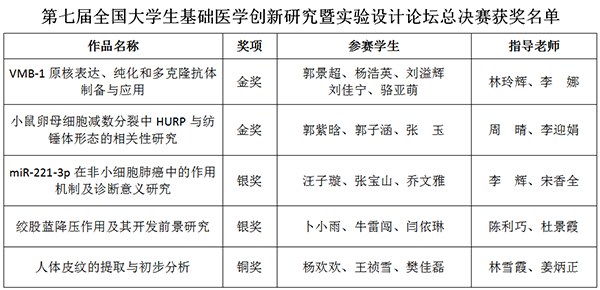 此次大赛历时近10个月,共有全国31个省市、210多所院校的1万多名学生参加。科研科和基础医学部周密细致抓好筹备工作,临床医学系和口腔医学系的同学们在基础医学部教师的悉心指导下,利用课余时间不断进行实验,完善科研课题设计,学校领导高度重视,多次到现场指导。比赛过程中,他们凭借扎实的基本功和过硬的心理素质,以出色的发挥取得优异成绩。此次比赛,全面展现了学校教学水平和学生综合素质,对进一步提高教师科研能力、促进创新型基础医学人才培养起到了很好的推动作用。