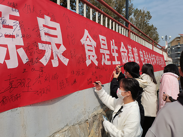 10月29日中午,护理系在学校食堂门口开展“节粮、节水、节电”签字活动。活动中,多才多艺的同学在食堂门口进行才艺演出,用优美的歌声、酷炫的武术和舞蹈向同学们诠释“节粮、节水、节电”的重要意义,路过的千余名师生纷纷在"水是生命源泉、食是生命基础、电是生命光环、珍惜点滴资源"条幅上签下自己的名字,表达了“节粮、节水、节电”的决心。