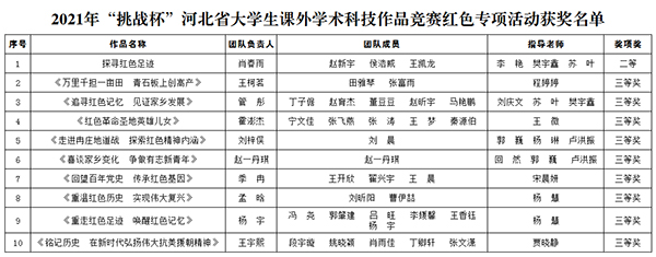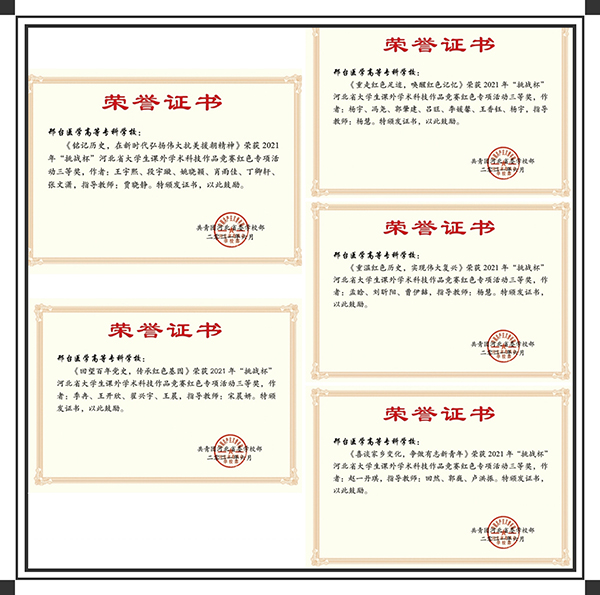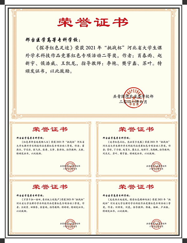 李艳、樊宇鑫、苏叶老师指导的《探寻红色足迹》项目荣获河北省大学生课外学术科技作品竞赛红色专项活动二等奖;程婷婷老师指导的《万里千担一亩田,青石板上创高产》项目,刘庆文、苏叶、樊宇鑫老师指导的《追寻红色记忆,见证家乡发展》项目,王微老师指导的《红色革命圣地英雄儿女》项目,郭巍、杨琳、卢洪振老师指导的《走进冉庄地道战,探索红色精神内涵》项目,回然、郭巍、卢洪振老师指导的《喜谈家乡变化,争做有志新青年》项目,宋晨妍老师指导的《回望百年党史,传承红色基因》项目,杨慧老师指导的《重温红色历史,实现伟大复兴》、《重走红色足迹,唤醒红色记忆》项目,贾晓静老师指导的《铭记历史,在新时代弘扬伟大抗美援朝精神》项目,分别荣获河北省大学生课外学术科技作品竞赛红色专项活动三等奖。