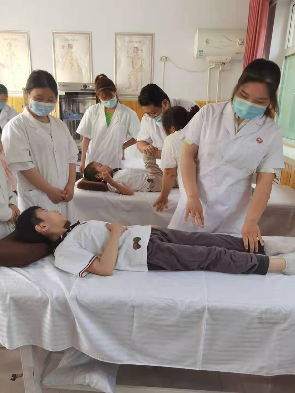 针推、康复教研室教师利用专业特长为五名儿童提供了身体检查、推拿按摩、康复治疗等服务,给家长讲解了正确的保健方法和有效的康复经验。
