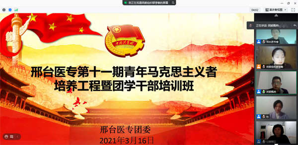为了深入学习贯彻习近平新时代中国特色社会主义思想和党的十九大精神,提高开元学生骨干、团干部、青年知识分子等青年群体的思想政治素质、政策理论水平、创新能力和实践能力,校团委举办了线上邢台医专第十一期青年马克思主义者培训工程暨团学干部培训班。3月16日举行了开班仪式,共计300余人参加。