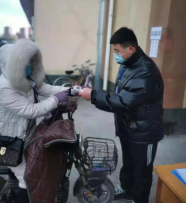 2020级普中药1班李佳怡同学在保定市安新县计生局小区参与志愿服务,负责为来往人员测量体温、做好信息登记、宣传疫情防护常识等,尽己所能为家乡防疫贡献一份青春力量。