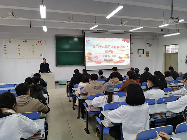 11月24日,学校党委副书记杜成旭在2019级普口1班教室为口腔医学系和药学系师生宣讲党的十九届五中全会精神。口腔医学系和药学系全体行政人员、党总支、党支部委员、专兼职辅导员、教研室主任和学生代表100余人到场学习。宣讲会由口腔医学系党总支书记王振敏主持。