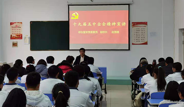 赵国增副校长围绕《中共中央关于制定国民经济和社会发展第十四个五年规划和二〇三五年远景目标的建议》,在回顾“十三五”时期经济社会发展取得的一系列成就的同时,结合鲜明生动的案例对“十四五”规划及二〇三五年远景目标进行了全面深刻的讲解,帮助师生深入领会和把握党的十九届五中全会精神的核心要义。赵国增副校长还结合河北省委书记王东峰在庆祝河北省政协成立70周年座谈会上的讲话和邢台市委书记钱三雄到开元宣讲党的十九届五中全会精神宣讲报告,从开元学生观念树立、道德养成、职业发展等多角度对学生提出了具体要求。他号召广大学生要增强自律、热爱劳动、提倡环保、从我做起,养成良好的生活习惯;珍惜时间、刻苦学习、造就本领、医者仁心、救死扶伤,为报效国家、实现梦想打下坚实的基础,做德智体美劳全面发展的社会主义建设者和接班人。