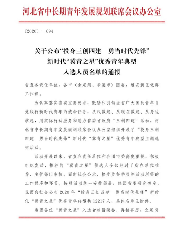 2020年“投身三创四建 勇当时代先锋”新时代“冀青之星”优秀青年典型主题选树活动由共青团河北省委、河北省中长期青年发展规划会议联席办公室联合组织开展。该活动自8月正式启动以来,学校团委认真谋划、广泛动员、精心组织,经系部推荐、评委会评选、主管领导审核,共计17名师生获得参评资格,并最终全部当选。