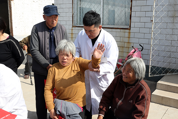 义诊现场,开元第二附属医院神经内科、心血管内科、消化内科、骨二科、普外科、妇科、功能科等专家热情耐心接待每一位村民,细致询问患病村民病史,进行心电图、血压、血糖、妇科等项目的检查,提供医疗咨询服务,详细交代药物的服用方法及注意事项。骨二科副主任医师王春岭手法精到,细心为病患做按摩,活络筋骨,有效缓解了不适症状;妇科主任医师曹耀辉耐心与90多岁老人沟通,老人听力不好、说话不清楚,就一字一字耐心听、一句一句大声说,为老人进行了细致周到的检查,耐心将诊治建议告诉其孩子;功能科主治医师王占美从活动一开始就不停地为村民做血糖检查,一会儿也没有休息……