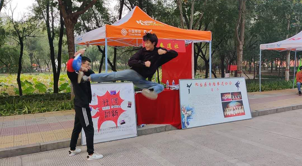 天使路上各学生社团“安营扎寨”“招兵买马”,大家纷纷拿出看家本领,开始了“抢人大战”,现场既有跆拳道表演,汉服展示,还有精彩的花式轮滑、足球技巧表演、读书体会分享等等,吸引了众多新生。“挽你手为你比心,加入我们你就是医专社联小甜心”“挑战就是机会,突破就是成长,来这里团团带你乘风破浪”,团委的纳新宣传亲切又接地气,一下就拉近了与学生的距离。