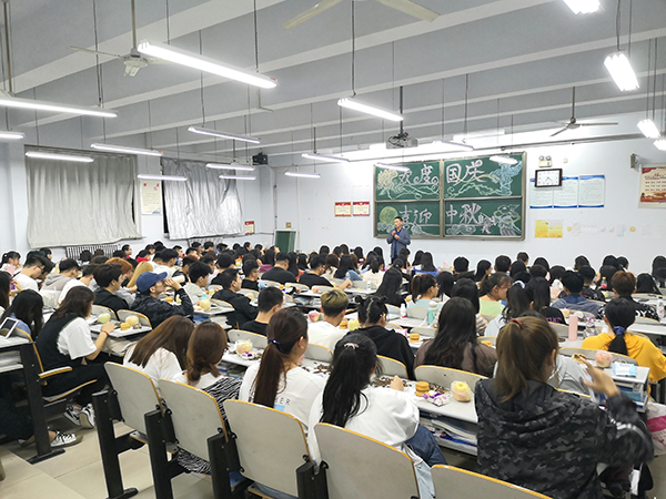 10月1日晚,各班举办茶话会,组织观影、诗歌朗诵等一系列精彩纷呈的文化艺术活动,辅导员代表学校送去了双节的慰问与祝福并向学生们发放月饼和苹果。
