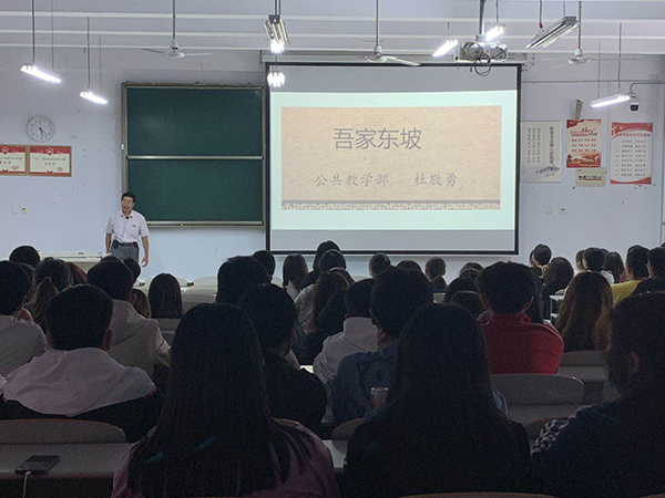 9月25日下午,公共教学部举办的国学经典第二课堂活动在8号教学楼一层阶梯教室开课。公共教学部杜敬勇老师带来了第一讲,他主讲的题目是《吾家东坡》,100余名各系学生到场聆听。