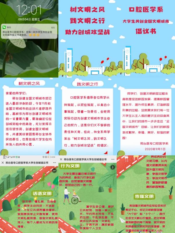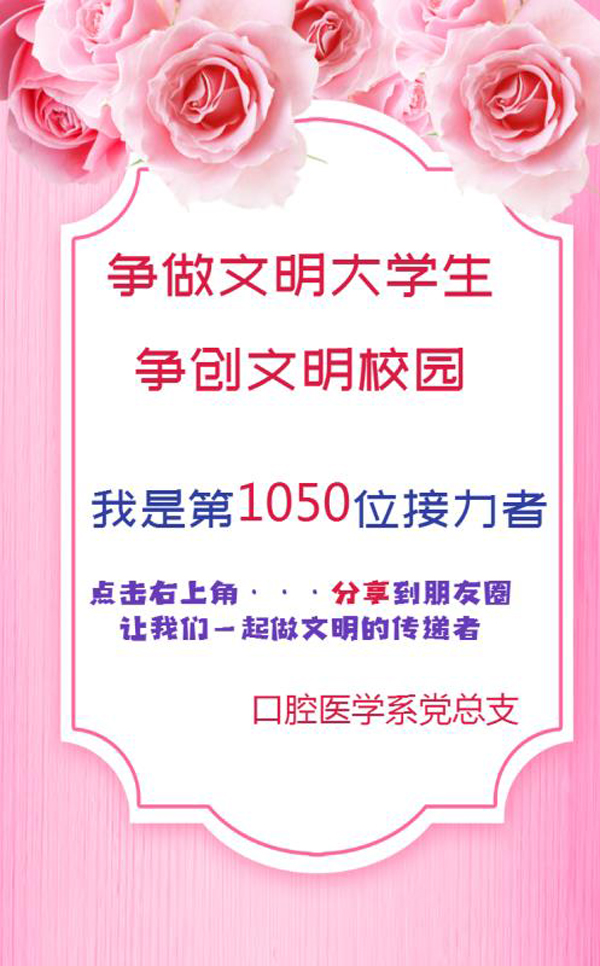 党总支制作网络微传单,发起《口腔医学系大学生共创全国文明城市倡议书》,从话语文明、行为文明、传播文明三个方面号召同学们养成良好的文明习惯,以内强文明素质来实现外塑文明形象,争做文明学生,争当文明市民,营造积极健康的校园氛围。一时间倡议书在微信朋友圈、微信群迅速传播,全系学生接力转发千余次,文明意识深入人心。