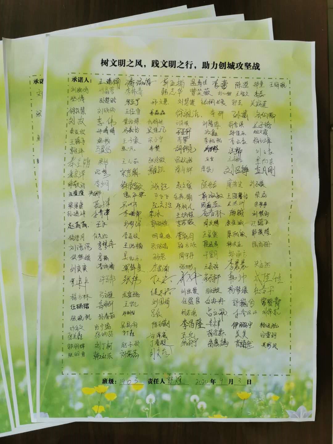 线下,每名同学在“树文明之风,践文明之行,助力创城攻坚战”承诺书上郑重地签下了自己的名字,表示要争做“全力创城的践行者、传递文明的示范者、树立新风的志愿者”。
