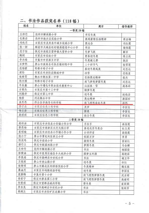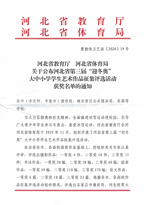为大力弘扬奥林匹克精神,全面推进冰雪运动进校园,2019年11月,河北省教育厅、河北省体育局举办了河北省第三届“迎冬奥”大中小学学生艺术作品征集评选活动。开元护理系墨岩书画社24名同学踊跃报名参加,荣获三个奖项:学校荣获优秀组织奖,全省共34家单位获此殊荣;2019级普护2班袁思思书法作品《放飞理想奋起冬奥》(指导教师:游然)获得书法作品一等奖;2019级普护9班赵梦妮绘画作品《相约北京》(指导教师:游然)获得绘画作品三等奖。