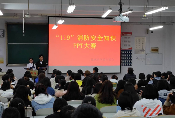 11月8日,举办“119”消防安全知识PPT大赛。临床系副主任刘庆文及全体辅导员出席并担任比赛评委。参赛的13个班级精心准备,通过一张张图文并茂的幻灯片,生动形象地展示了学生公寓、教室等日常生活场所存在的安全隐患。某商学院火灾等一例例由于消防意识淡薄所带来的惨痛教训,警示着在场的每一名的同学;“拔、握、瞄、扫”,朗朗上口的灭火器使用方法,提醒着同学们遇到火情应该如何应对。最后,2018级普临2班的参赛作品获得一等奖。