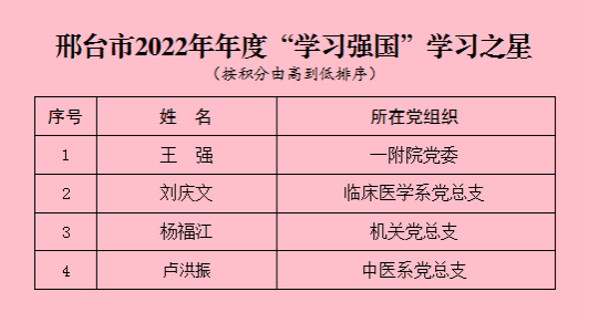 学校党委始终高度重视“学习强国”学习平台推广使用工作,将“学习强国”融入“开学动员会”和“开学第一课”,将平台中的丰富资源融入思政课程和课程思政,将“慕课”资源引入课堂教学,提升教学效果;定期开展校级“学习之星”评选、知识竞赛、经验分享等活动,进一步激发师生用好“学习强国”的积极性。学校共有166人获评校级“学习之星”,1名教师被选为邢台市“学习强国”宣讲团成员,1名教师获评省级“学习达人”,学习体会文章在学习强国总平台刊发。