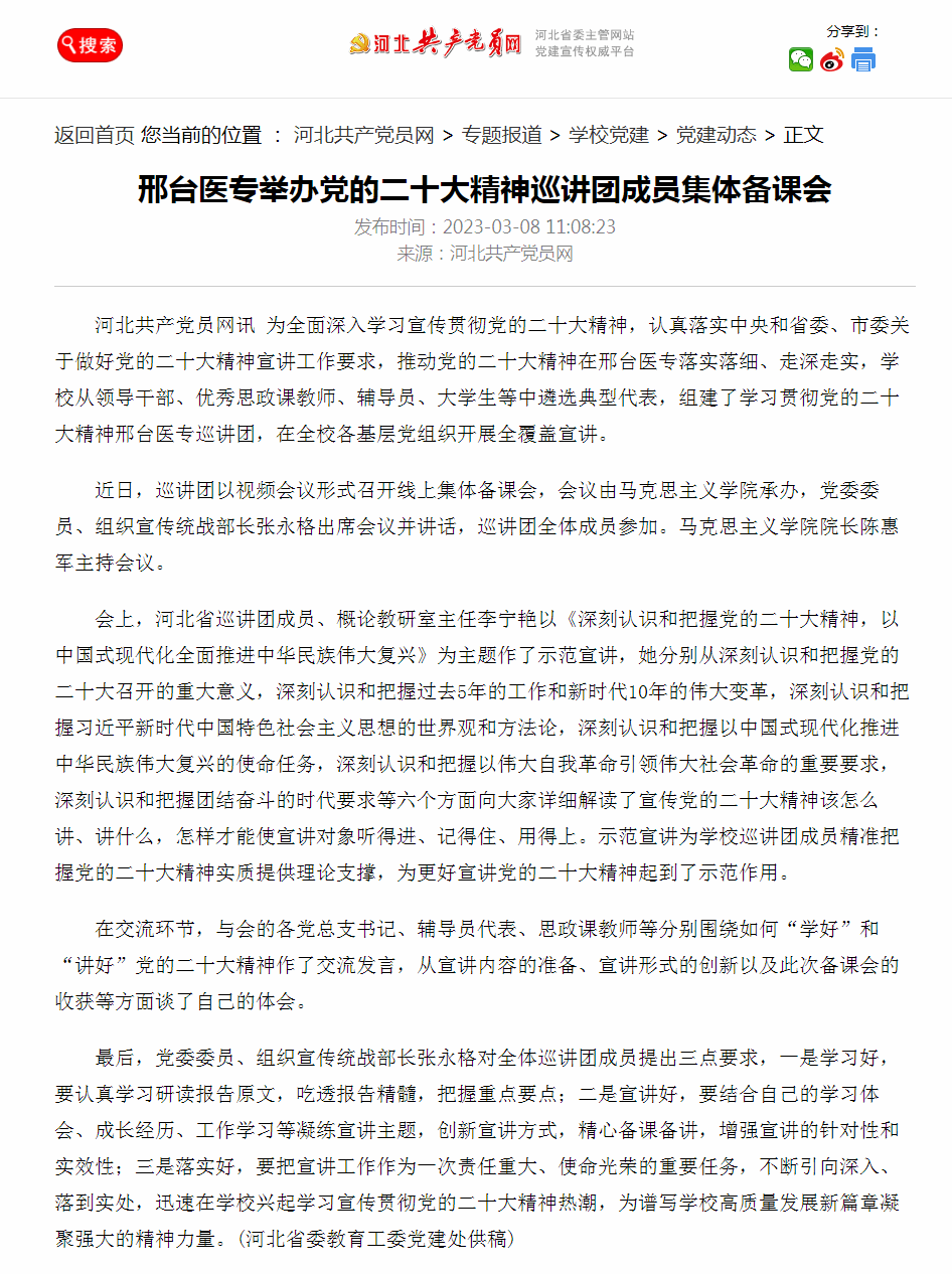 近日,河北共产党员网以“邢台医专举办党的二十大精神巡讲团成员集体备课会”为题,对开元学习宣传贯彻党的二十大精神情况进行了报道。