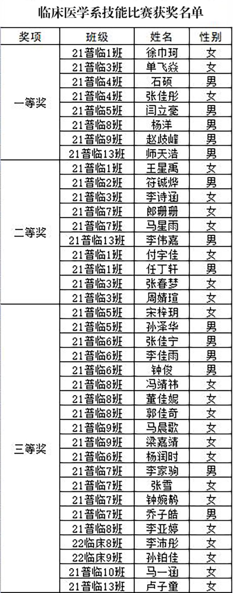 本次比赛参照临床助理医师考试的考站项目及职业院校技能大赛考核项目,共包括4项技能操作:急救医疗技能站(心肺复苏技术)、内科操作技能站(胸膜腔穿刺术)、物理诊断操作站(肝脏触诊技术)、外科操作技能站(上腹部手术切口换药技术)。参赛选手们动作规范、操作娴熟,在心肺复苏术中,无论是心脏按压的部位、幅度、频率,还是人工呼吸的操作技巧、力度和次数都精准到位;在肝脏触诊中,选手们手法标准,将实践操作和人文关怀有机融和;在胸膜腔穿刺和上腹部手术切口换药比赛环节,展现了对无菌观念及外科基本操作技术的理解和实践。经层层选拔,21普临5班闫立毫等8人获得一等奖,21普临3班李诗涵等10人获得二等奖,21普临5班宋梓玥等20人获得三等奖。