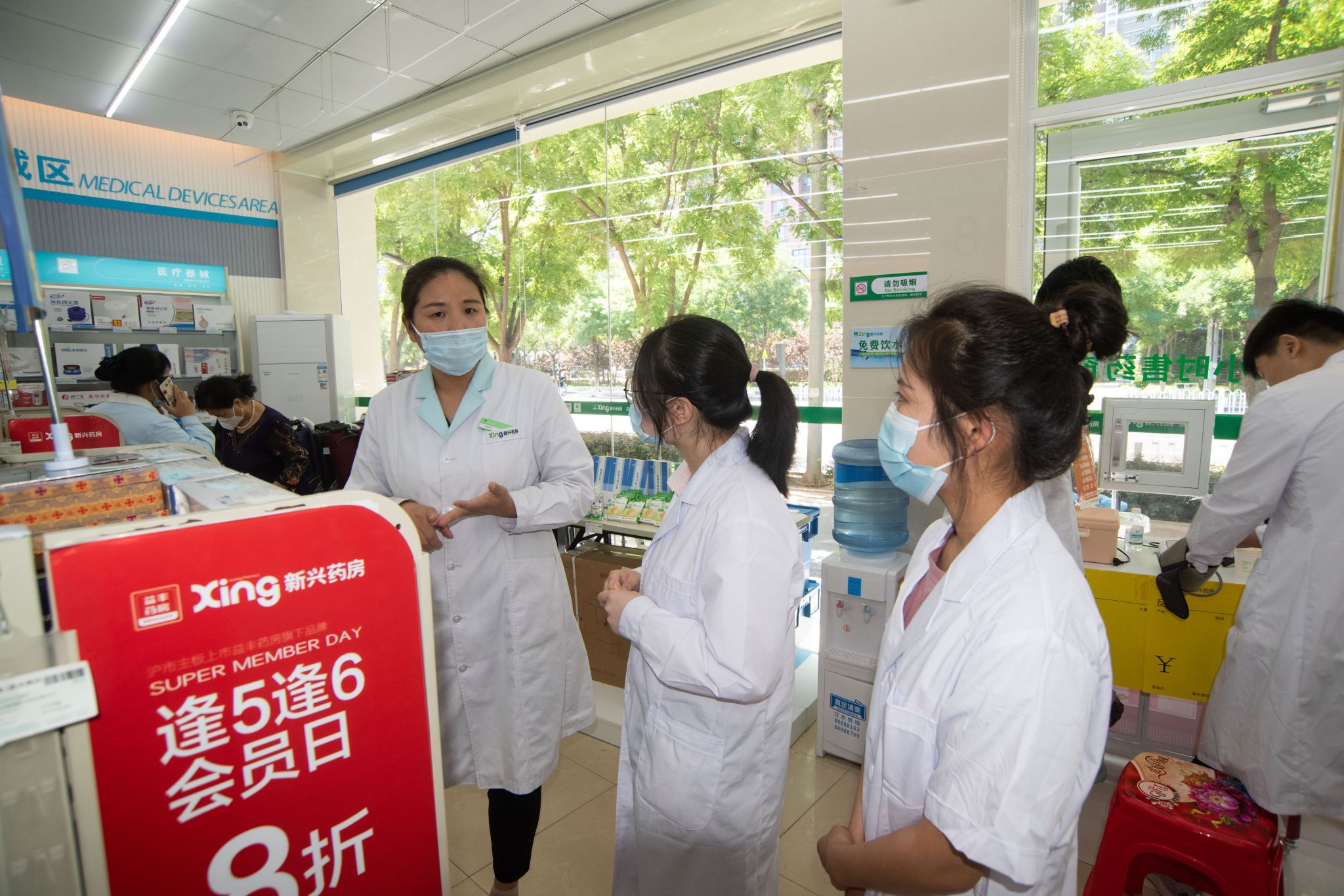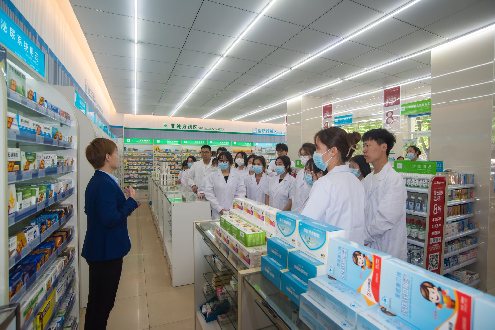 5月13日,药学专业2021级学徒制班的30多名学生在药学系党总支书记田振晓和副主任郭树怀、张立峰带领下前往益丰新兴大药房钢铁路分店开展见习实践教学。
