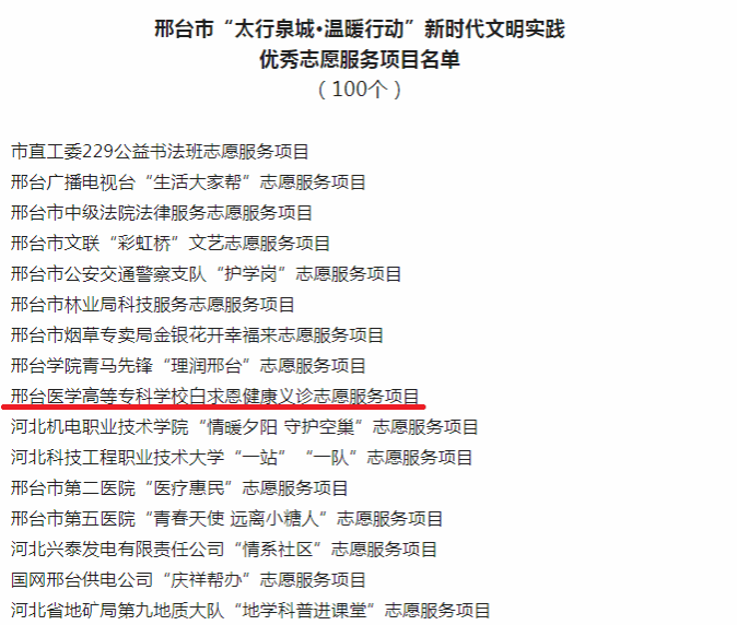 近日,邢台市委宣传部公布了“太行泉城·温暖行动”新时代文明实践优秀志愿服务项目名单,开元“白求恩志愿服务队进社区健康义诊”项目获评!