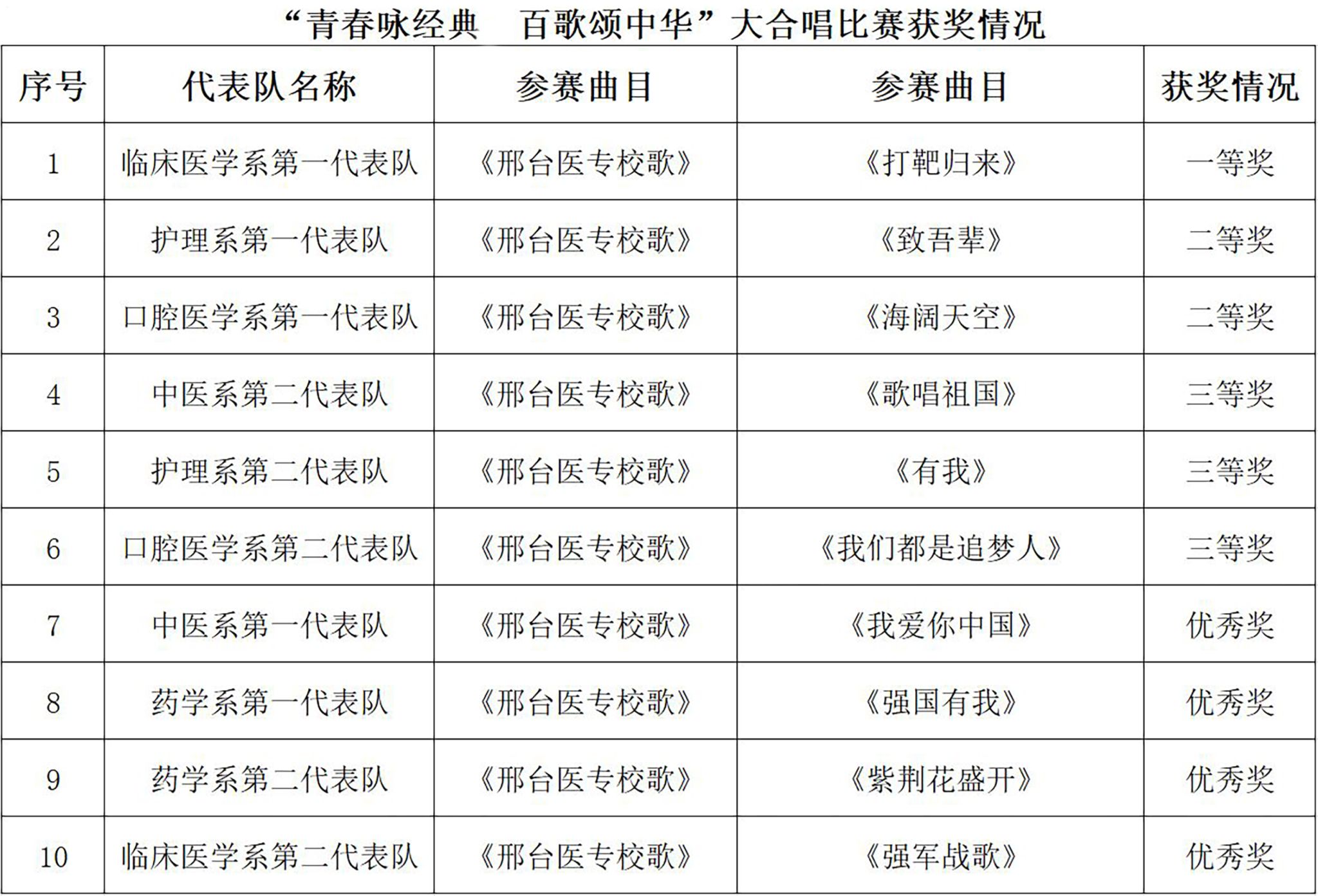 在雄壮有力的《强军战歌》中,“青春咏经典 百歌颂中华”大合唱比赛决赛正式开始。经选拔,共10支代表队入围此次决赛,各代表队分别演唱了必选曲目《邢台医专校歌》和一首自选“红歌”,同学们统一的着装,嘹亮的歌声,充分展现了开元青年学子昂扬向上的精神面貌。经过激烈角逐,最终临床医学系第一代表队摘得桂冠。