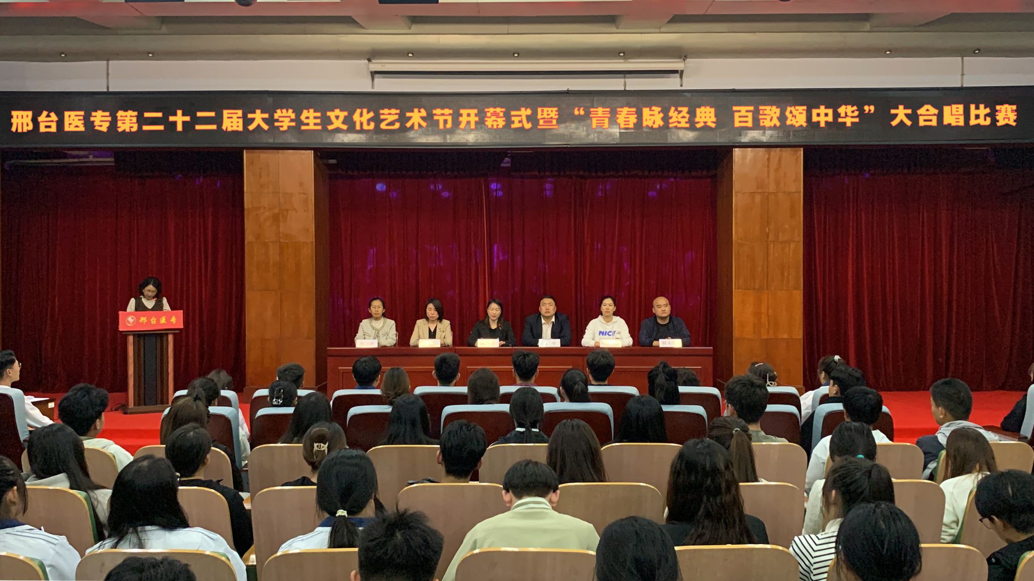 开幕式上,团委高亚楠老师宣读了《关于开展“邢台医专第二十二届大学生文化艺术节”活动的通知》;第二十一届大学生文化艺术节大合唱比赛一等奖团队代表临床医学系索阳阳发言,他号召同学们积极参加校园文化活动,做素质全面、情操高尚的新时代青年。团委副书记杜庆岩在开幕式上对同学们提出三点期望:一是踊跃参与校园文化建设,在良好校园文化熏陶下不断提升自我修养;二是以精品力作展现邢医风采,在文化艺术节大舞台上,以富有创意和激情的艺术作品展现邢医学子的青春风采;三是坚持在探索奋斗中寻求自我价值,以文化艺术节为契机,大胆创新,积极探索,放飞人生梦想,寻求自我价值。