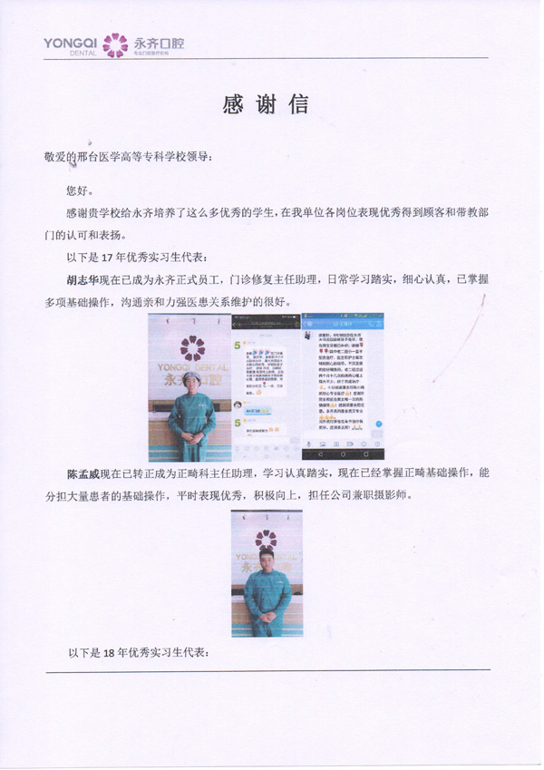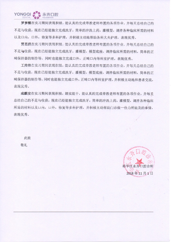 近日,石家庄永齐口腔诊所来信对开元2016级实习生罗梦醒等4名学生在实习期间优异表现提出表扬。同时,对在该单位实习并留用的2015级学生胡志华、陈孟威2名同学踏实认真、勤奋好学的工作态度高度赞赏。