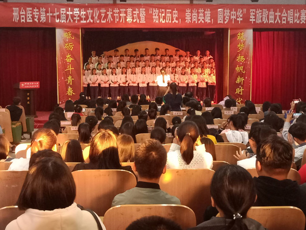 开幕式后进行了本次艺术节第一场活动——“铭记历史,崇尚英雄,圆梦中华”军旅歌曲大合唱比赛。比赛由临床医学系团总支承办。各系经过初赛分别选送两到三支优秀代表队参赛,每个参赛队演唱两首歌曲,一首必唱歌曲为中国共青团团歌《光荣啊!中国共青团》和一首选唱军旅歌曲。