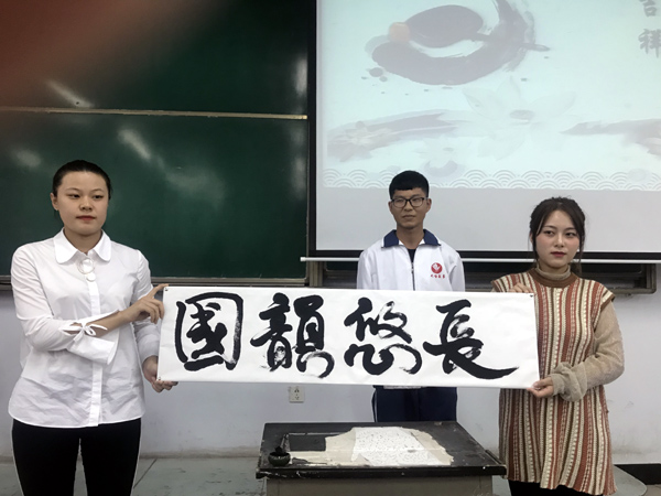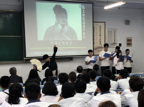 打造“短小精悍、寓意深远”的亮点环节,引导师生感受国学魅力,提高道德修养,提升思想境界。在唱歌曲环节,歌舞诗《重回汉唐》,优美大气、神采飞扬的扇子舞表演与高亢雄浑的吟唱配合,为同学们展示了汉唐文化的发展与繁荣。读经典环节,宣讲员或身着汉服,在舒缓的古典音乐背景下,吟诵、演绎国学经典篇目《师说》;或带领师生齐诵《少年中国说》《朱子治家格言》《道德经》《论语》等经典篇目,一同汲取传统文化精髓,品味语言文化魅力。送吉祥环节,宣讲员现场挥毫泼墨为大家送上祝福,愿中华传统文化源远流长。