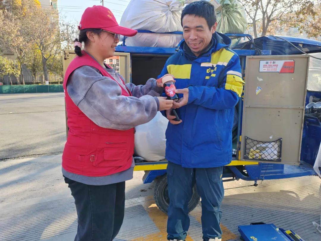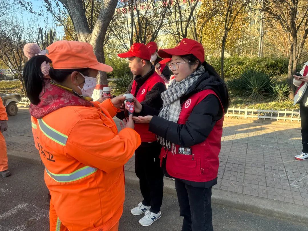 大学生志愿者们和食堂工作人员一早就忙碌起来,洗姜、切姜、煮茶、熬制,只为在寒冷的冬日为大家送上一份温暖。一切准备就绪,大学生志愿者们拎着保温瓶,拿着贴有志愿标志的茶杯,走出校园,走上街头,为环卫工人、快递小哥、外卖工作人员和执勤交警递上一杯热姜茶。“您好,请喝一杯热姜茶,暖暖身子吧。”“天气寒冷,一定要注意保暖啊。”一杯杯微不足道的姜茶,一句句贴心的问候,传递着爱心与温暖,大家收到热茶后脸上洋溢的笑容也让大学生志愿者们备受鼓舞。