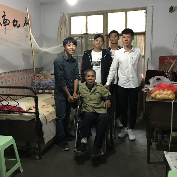 与往常一样,同学们来到郭大爷家就开始忙碌起来了,为老人打扫院子,整理房间,扫地拖地,擦窗户玻璃,不一会儿就把郭大爷的家收拾得干干净净。之后,同学们和老人一边品尝着月饼,一边聊天,从古代历史聊到当今时事,郭大爷知识面广而且还很健谈,在他的床头柜上整齐的摆放着各式样的书,让人印象最深刻的是一本《达芬奇密码》,郭大爷说:“人最需要的东西,是智慧,而获得智慧的方式就是多读书,从书中汲取养分。”通过交流,同学们感受到郭大爷虽然身体残疾,然而他乐观阳光的生活态度、积极向上的学习精神,值得每一个人学习。