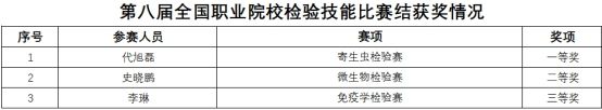 在第八届全国职业院校教师检验技能竞赛中,开元教师按照竞赛标准反复练习形态鉴别、试剂配制、样本提取和结果分析研判等操作,多次进行模拟训练,在比赛中拼搏进取、奋勇争先,从来自全国80余所高职院校的122名医学检验技术专业教师中脱颖而出,医疗技术系教师代旭磊以总分第一的成绩荣获寄生虫检验赛项一等奖,史晓鹏老师荣获微生物检验赛项二等奖,李琳老师荣获免疫学检验赛项三等奖。