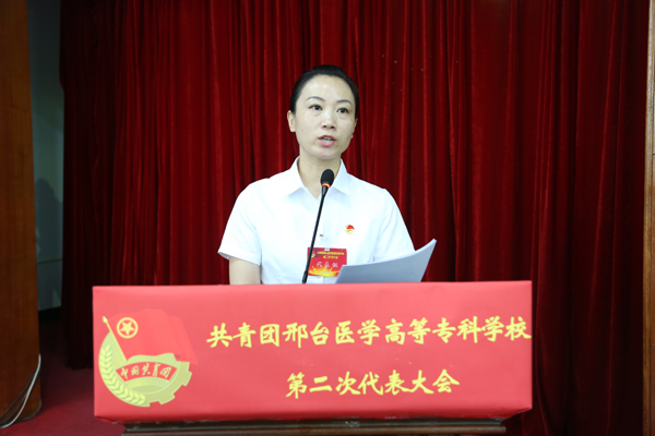 共青团邢台医专团委书记杜庆岩代表共青团邢台医专第一届委员会作了题为“不忘初心 砥砺前行 全面开创开元共青团工作的新局面”的工作报告。
