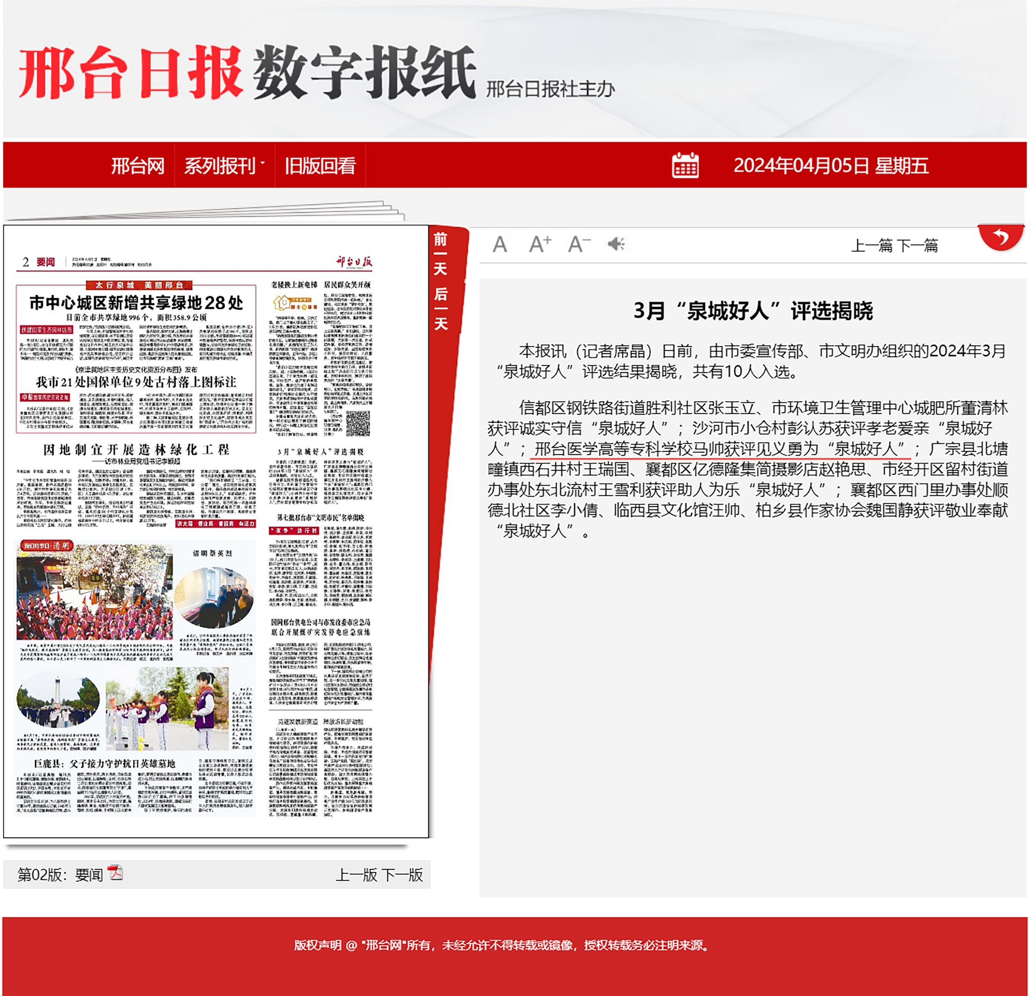 危急关头挺身而出救助老人,马帅生动诠释了“厚朴善美、勤奋自强”的城市精神,展现了邢医学子挺膺担当、助人为乐的良好品德。希望同学们以马帅为榜样,牢记医路初心,勇担时代使命,以实际行动践行医学生“健康所系,性命相托”的铮铮誓言。