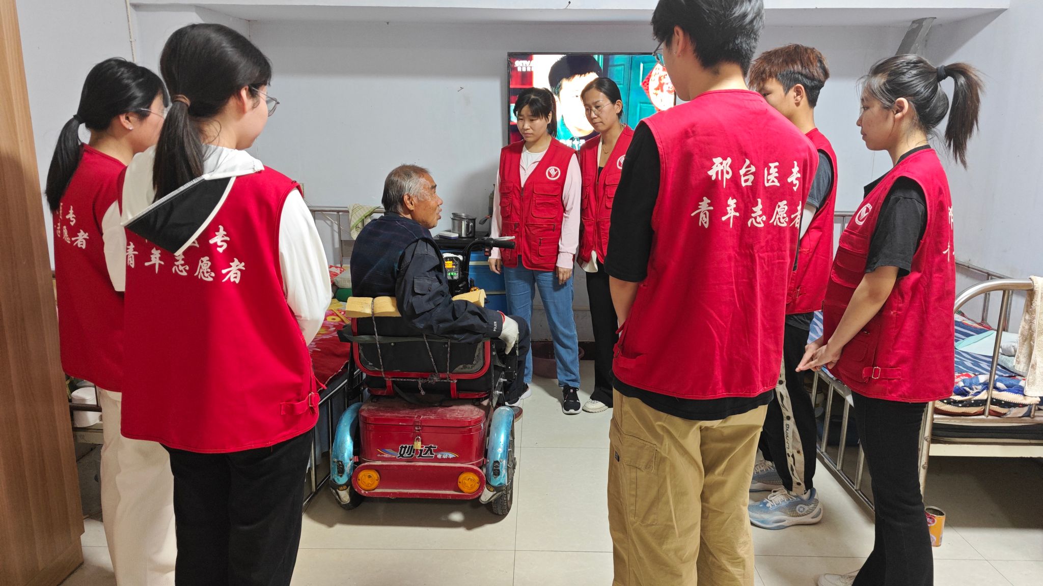 临床医学系9名师生志愿者来到滨苑老年公寓慰问了孤残老人郭合林,大家详细询问老人的身体情况和生活状况,帮助老人打扫房间卫生,整理床铺,和老人话家常,为老人表演节目,房间内一片欢乐祥和。