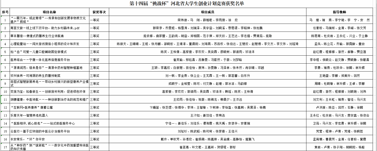 近日,共青团河北省委、省教育厅、省科学技术协会、省社会科学院、省学生联合会下发通知,公布第14届“挑战杯”河北省大学生创业计划竞赛作品获奖通报。开元喜获17个奖项,其中一等奖2个、二等奖2个、三等奖13个,取得了开元在该项赛事中的历史性突破,展现了开元师生勇于挑战、敢于创新的精神风貌。