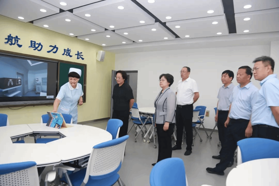 王俊华一行来到皇寺校区办公楼,参观了办学育人成果暨规划展,详细了解了开元历史沿革、师资培养、专业设置及附属医院建设等方面情况,并与学校党委书记、校长李建广就学校亮点工作、特色做法及未来发展规划等方面进行了交流。随后,王俊华一行实地考察学校规划建设用地,逐一观摩了居家照护实训室、康复保健实训室、儿科护理实训室、虚拟仿真实训室等教学实训室。参观中,领导多次驻足与工作人员互动交流,深入了解了学校实践教学模式及信息化教学平台建设情况,并针对人才培养、课程体系融合、校院、校企合作等方面提出了宝贵意见。