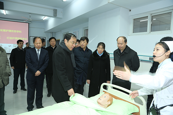 学校党委书记、校长李占华对崔慧先一行的到来表示欢迎并就学校“一校三院一中心”建设发展情况做了简要汇报。崔慧先一行实地参观考察了学校基础医学部、护理系实验实训室,第三附属医院和凰寺老年养护中心。来宾们详细了解了实验实训室设置、设备性能等情况,参观了第三附属医院门诊大厅和老年养护中心住养房间、老年病区、康复中心、活动室,详细了解各项基础设施设备使用情况、老年文化生活和心理慰藉开展情况及老人生活、学习情况,并与学校领导就深化校院合作、院院合作、校校合作等进行了深入探讨,形成共识。崔慧先校长高度评价了开元为医学教育、医疗卫生、大健康产业做出的贡献,对开元特色鲜明、全国领先的“一校三院一中心”的办学格局和“教医养”深度融合的人才培养模式深表赞赏。崔慧先表示,河北医科大学、省四院、省二院有责任贯彻落实“健康中国”决策部署,引领河北省医教发展理念,加强地方高校之间的联系、沟通和合作,实现相互促进、共同发展。