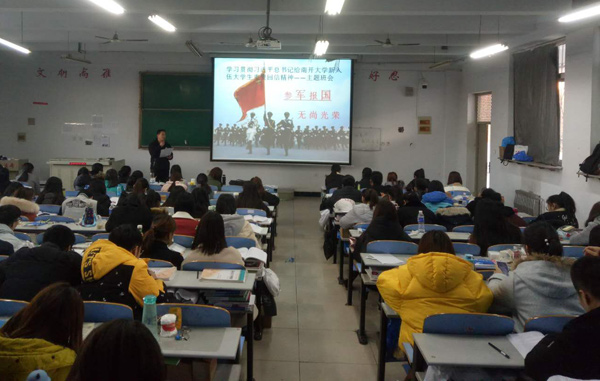 王老师首先向同学们传达了《习近平总书记给南开大学8名新入伍大学生的回信》原文及《中共教育部党组关于学习贯彻习近平总书记给南开大学新入伍大学生重要回信精神的通知》,然后通过将回信精神与深入学习习近平总书记系列重要讲话精神结合起来,教育引导大学生主动投身军营,以实际行动实现强军梦的伟大实践中,使同学们感受到总书记对当代青年大学生成长的关心关爱和殷切期盼。
