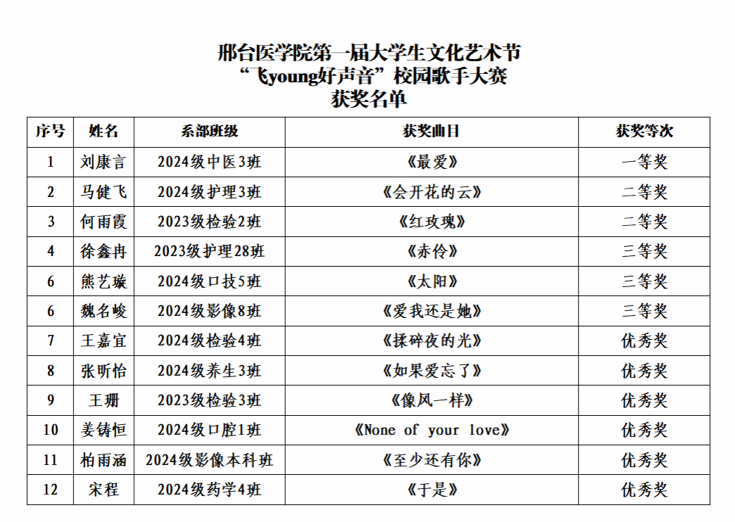 校园歌手大赛中,12名选手从前期初赛、复赛中脱颖而出进入决赛。比赛中,他们或演唱民谣小调,或演唱动感摇滚,一首首风格迥异的歌曲不时赢得现场观众的齐声喝彩。经过激烈角逐,2024级中医3班刘康言获得大赛一等奖。