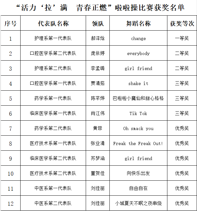 啦啦操比赛中,12支代表队经过前期初赛、复赛选拔入围决赛。比赛中,他们着装统一、精神饱满,编排的啦啦操欢快灵动、魅力四射,跳出了青春的姿态,展现了蓬勃的朝气。最终护理系第一代表队摘得桂冠。