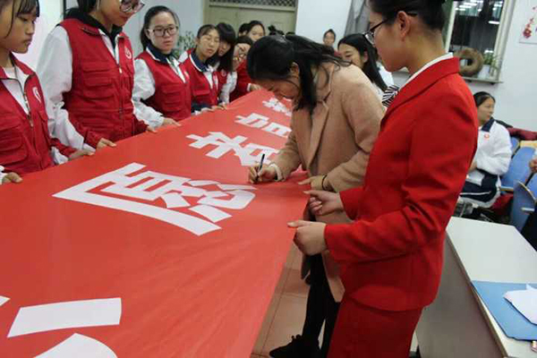 活动在全体青年志愿者高唱《青年志愿者之歌》的歌声中拉开帷幕。大家一起回顾了近年来,开元青年志愿服务工作和青年志愿者协会建设的基本情况。由青协代表演唱的歌曲《爱心无限,志愿同行》,用新颖的形式表达了志愿者们践行“奉献、友爱、互助、进步”的志愿服务精神的决心和信心。2016级普中医班徐亚茹同学带领全体青年志愿者进行了庄严的宣誓。2016级普中医班毛新宇同学表示,是爱心与责任引导她加入青协,也是爱心与责任让她坚持下去,今后要进一步践行志愿服务精神,让爱心永存校园,用真情贡献社会。2017级普影2班郑佳兴同学代表新生发言,表示要在帮助他人的实际行动中,体会志愿服务的快乐,以诚待人,培养自己的责任精神。最后,全体同学在条幅上签名,表达了脚踏实地、甘于奉献、践行自己对社会承诺的决心。