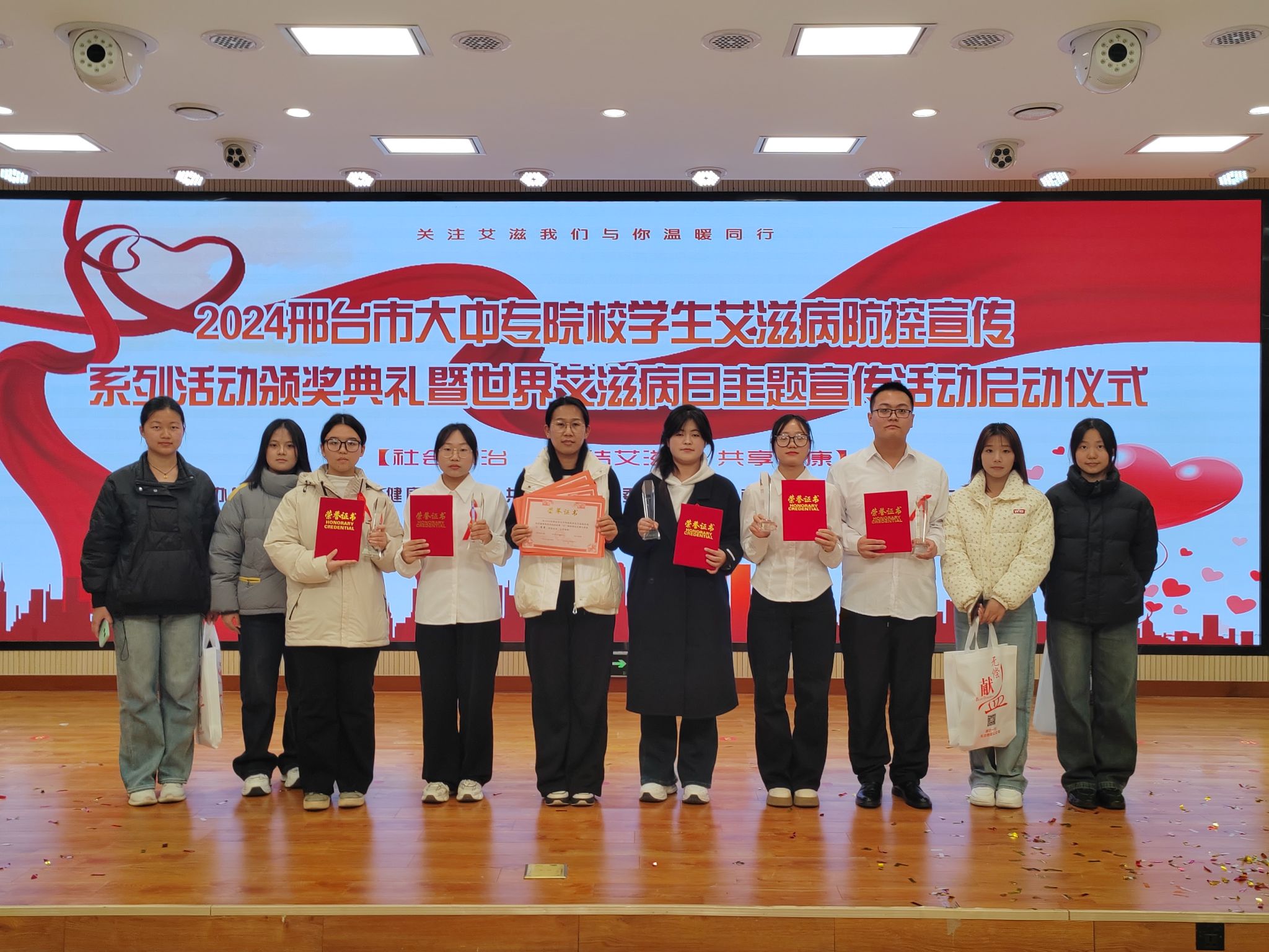 邢台市大中专院校学生艾滋病防控宣传系列活动包括辩论赛、宣传作品征集比赛和云竞赛等,开元团队获辩论赛三等奖,8个作品在宣传作品征集比赛中获奖,其中一等奖1个、二等奖2个、三等奖1个;12833名同学参加云竞赛,平均分位居前列,学校获优秀组织奖。