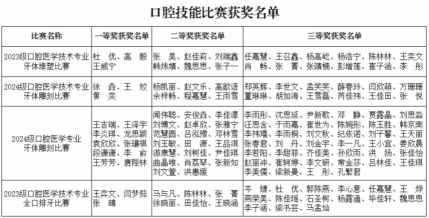 牙体堆塑比赛中,同学们手指灵活舞动,精准地将瓷粉一点点堆砌在模型上,逐渐恢复或重建牙体外形;牙体雕刻比赛中,同学们手持雕刻工具,稳稳地落下每一刀,快速准确地将一块块石膏精心雕琢成形态逼真、比例精确的牙齿模型;全口排牙比赛中,同学们手法娴熟,在规定的时间内将一颗颗牙齿精准地排列放置在口腔模型上。经过激烈角逐,共76人分获一、二、三等奖。