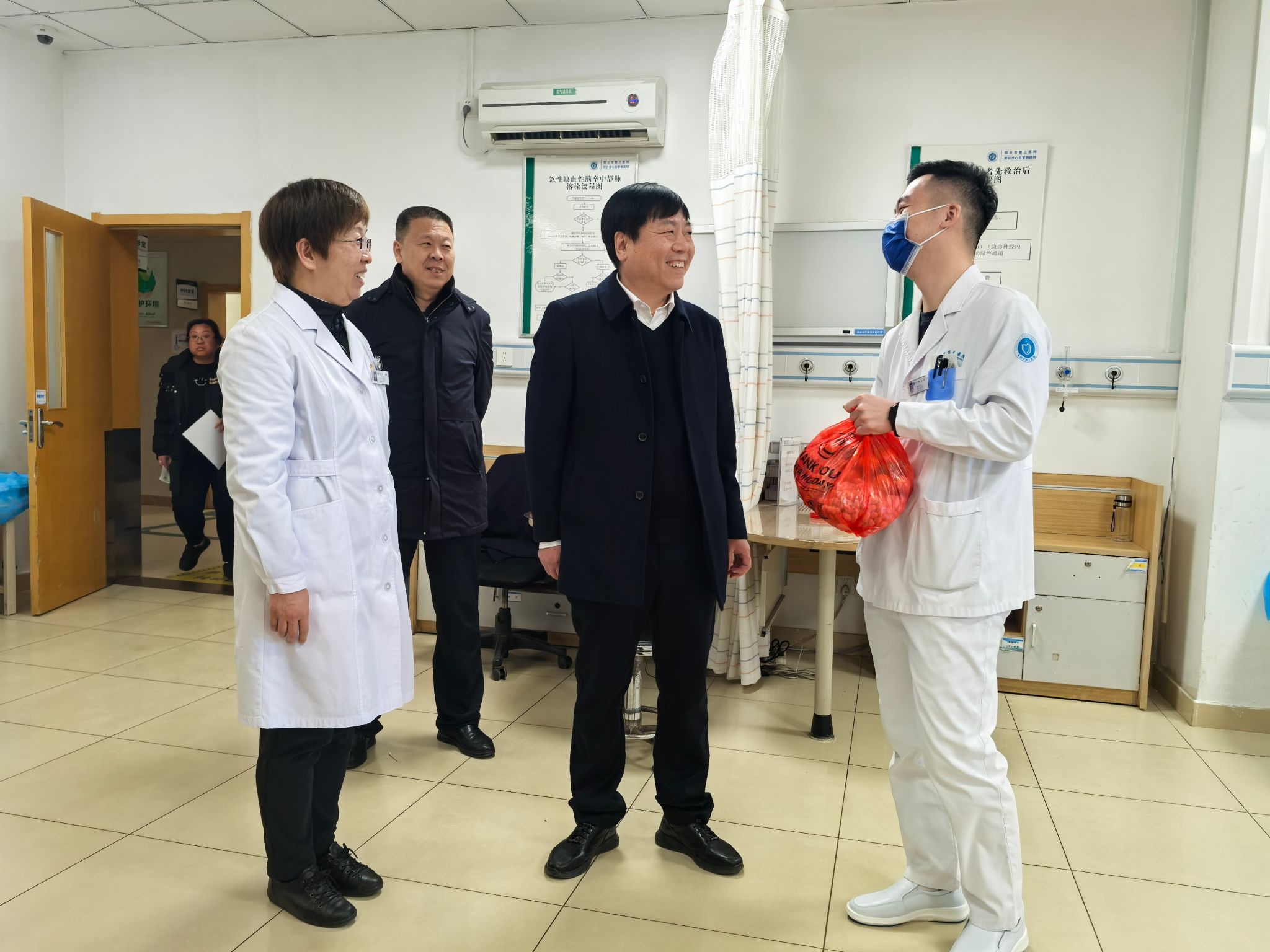 在第二附属医院西院区、东院区和附属医院(市中心医院),校领导走访了导诊台、收费处、急诊科、影像科、心内科门诊、肿瘤内科病区、神经内科病区等科室,与医护人员亲切交流,勉励他们继续发扬恪尽职守、无私奉献、担当实干的精神,在新的一年里,持续提升医疗技术水平,着重加强教学科研能力,为推动医疗卫生事业发展,守护人民群众健康福祉贡献更大力量。