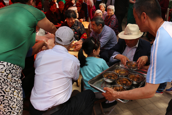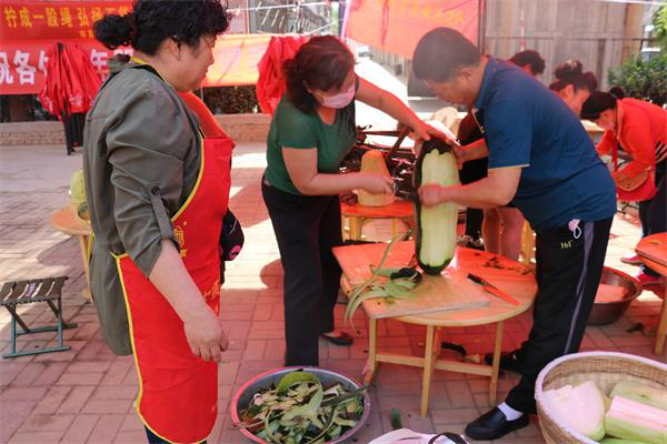 一大早,志愿者们就开始忙活起来,到处欢声笑语、热闹非凡,有的烧水、有的炸豆腐、有的炸丸子、有的炖肉,还有的志愿者展示着自己的熟练的刀工,不一会就将冬瓜切了满满几大框,这边忙活着,那边的大铁锅也架了起来,准备来一场别开生面的大锅菜盛宴。志愿者们有条不紊将各种食材放进锅里,不一会香喷喷、热气腾腾的大锅菜出了锅。社区的工作人员和志愿者们请来了本社区60岁以上老人、五保户家庭、孤寡老人、环卫工人等,还把大锅菜送到了行动不便的老人家里,共计有300余名居民住户吃上了香味四溢的大锅菜。