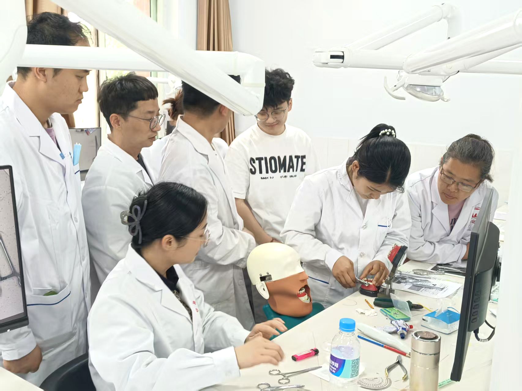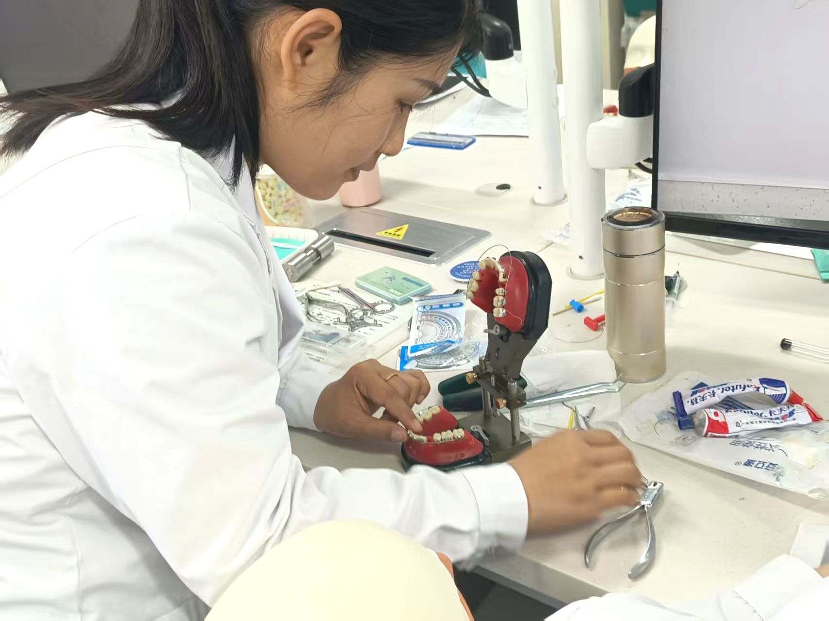 学员在仿头模上练习弓丝调试