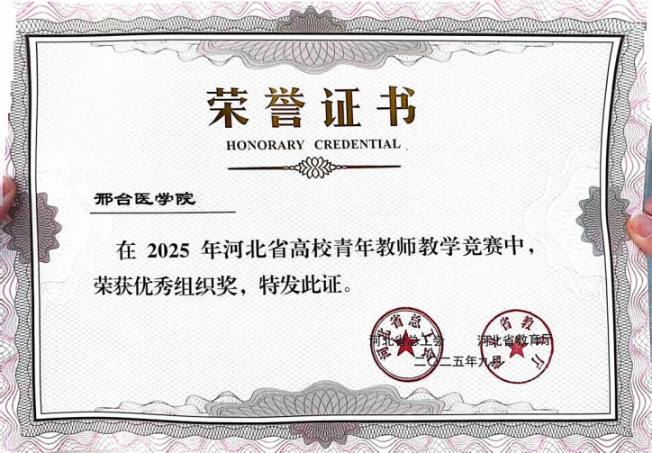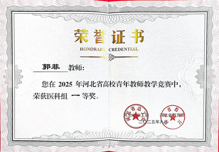 9月30日,由河北省总工会、河北省教育厅联合主办的全省高校青年教师教学竞赛圆满落幕。基础医学部药理教研室郭菲老师凭借扎实的教学功底、创新的教学设计与出色的现场发挥脱颖而出,斩获一等奖,开元荣获“优秀组织奖”。